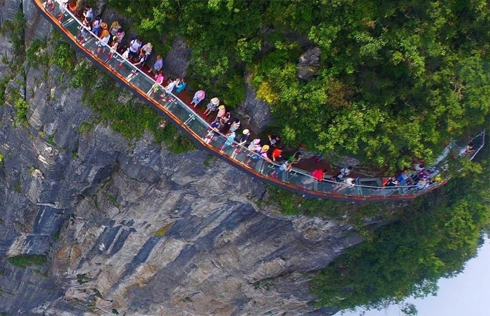 نام این پل، کلیف واک کویلینگ دراگون است که 1500متر طول دارد و کف آن از شیشهای ضخیم به قطر 35/6 سانتیمتر است و مانند هالهای از وحشت بر فراز کوه قرار گرفته است. افرادی که جرات رفتن روی این پل را دارند میتوانند از چشمانداز جاده لذت ببرند، این جاده به دلیل 99 پیچ تند خود به نام جاده ی پرپیچ و خم هم شناخته میشود.